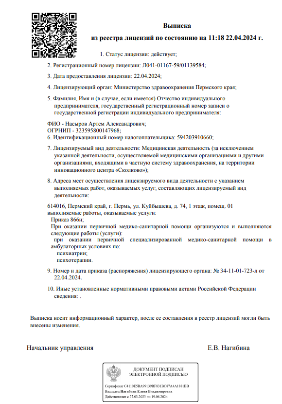 - По предварительной записи, Диагностика и лечение психических расстройств у взрослых и детей, психотерапия. Руководитель - Насыров Артем Александрович